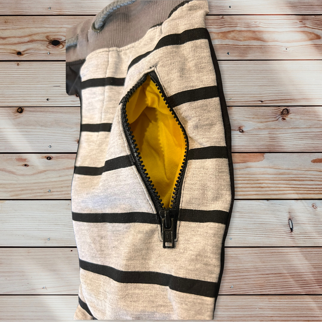 🧵Pockets are lined with yellow fabric. Solid and stripe leg jogger with diagonal zip detail
