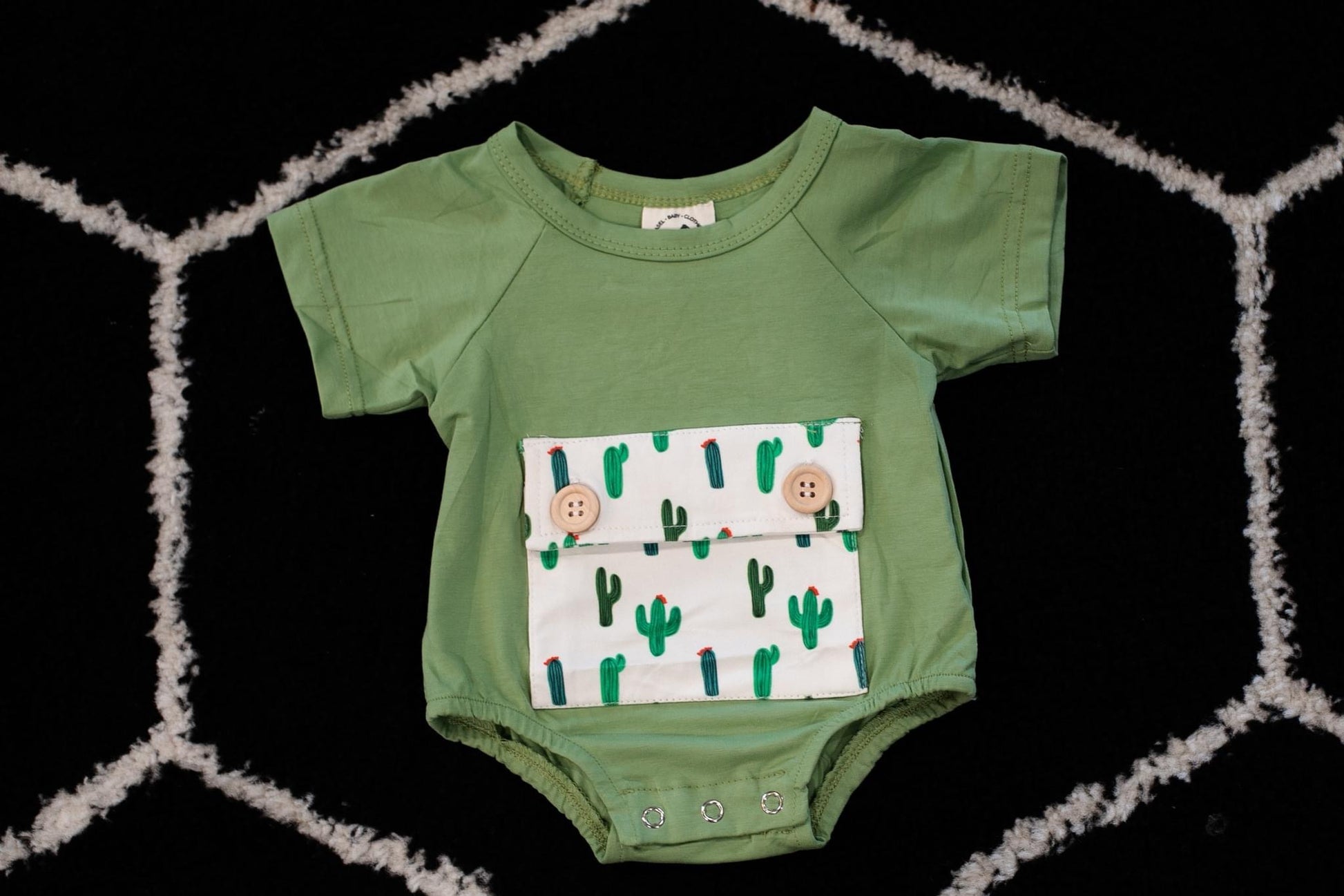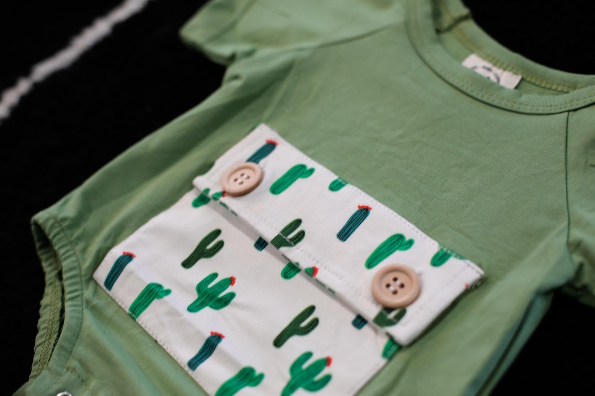 The cutest little t-shirt romper with a cactus patterned pocket on the front. Features functioning buttons.