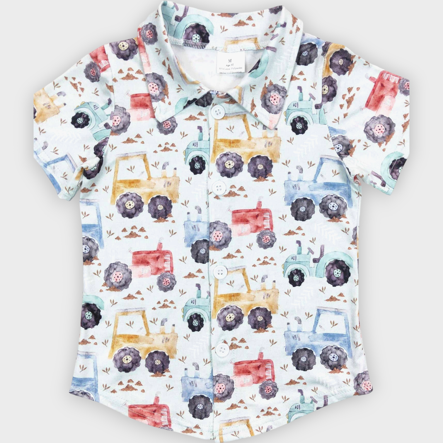 A button up shirt featuring a colorful, spring tractor design. Perfect for Easter festivities.