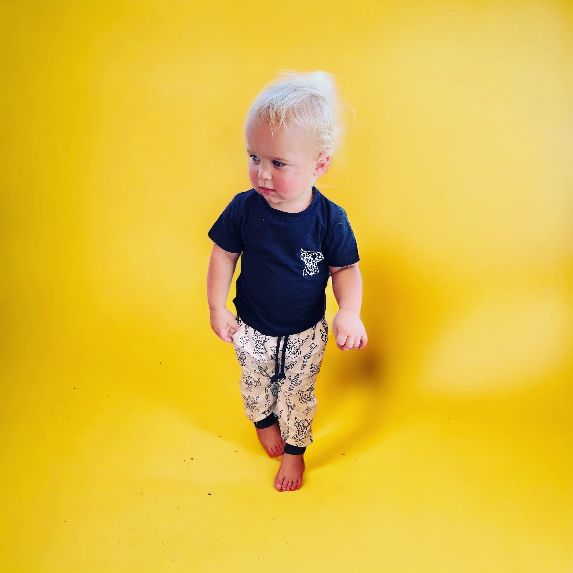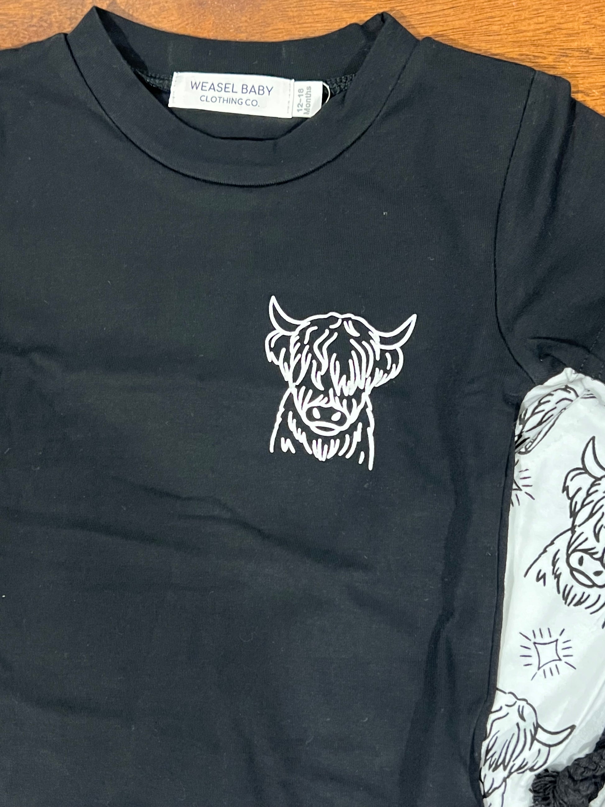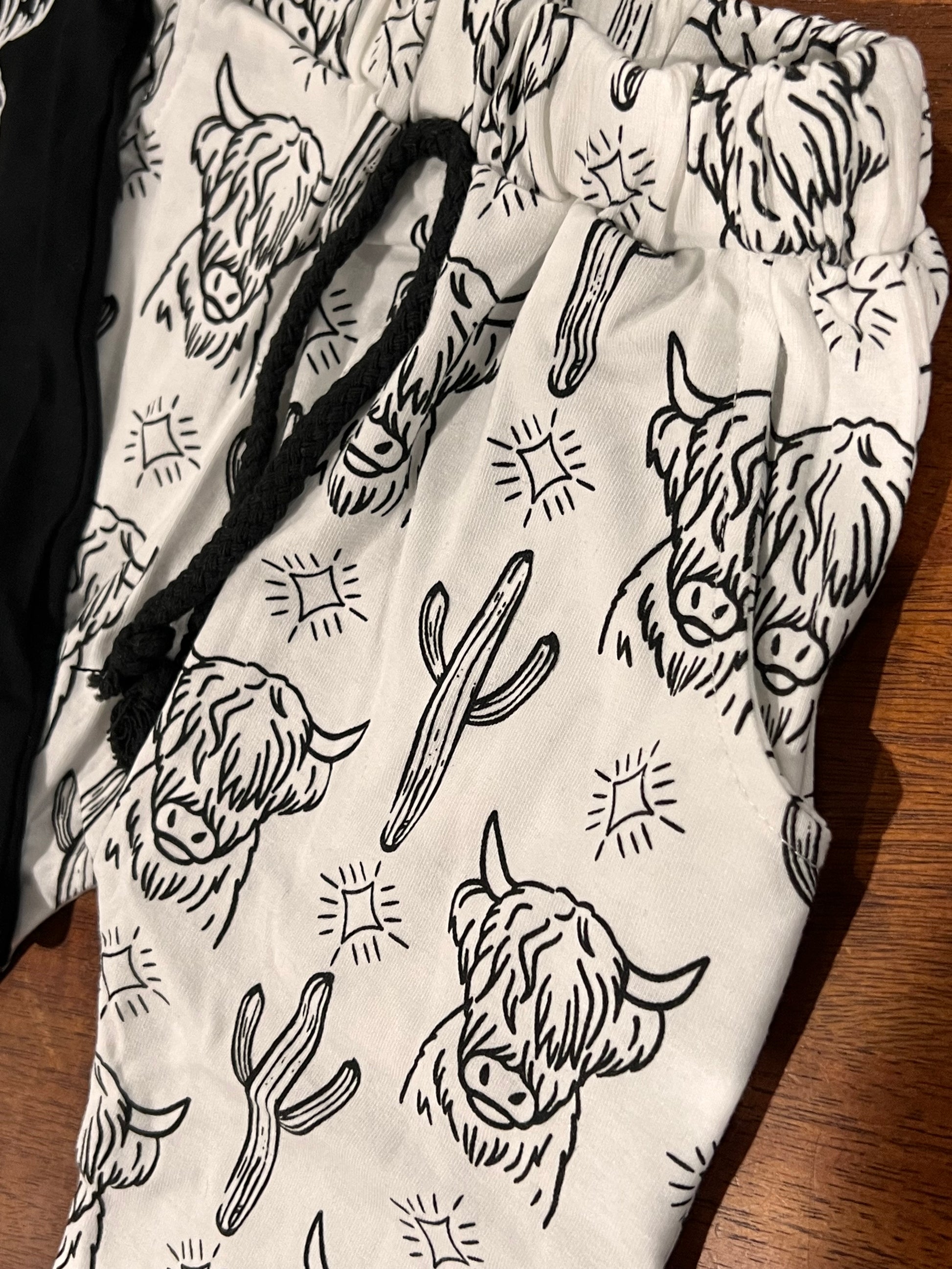 This set comes with the top & pants. Top is a black tee featuring a highland cow on the left pocket. Matching pants are white with an adorable highland cow & cactus design, featuring black trim at the ankles for a jogger style pant and a black tie at the waist. Material is a cotton blend.